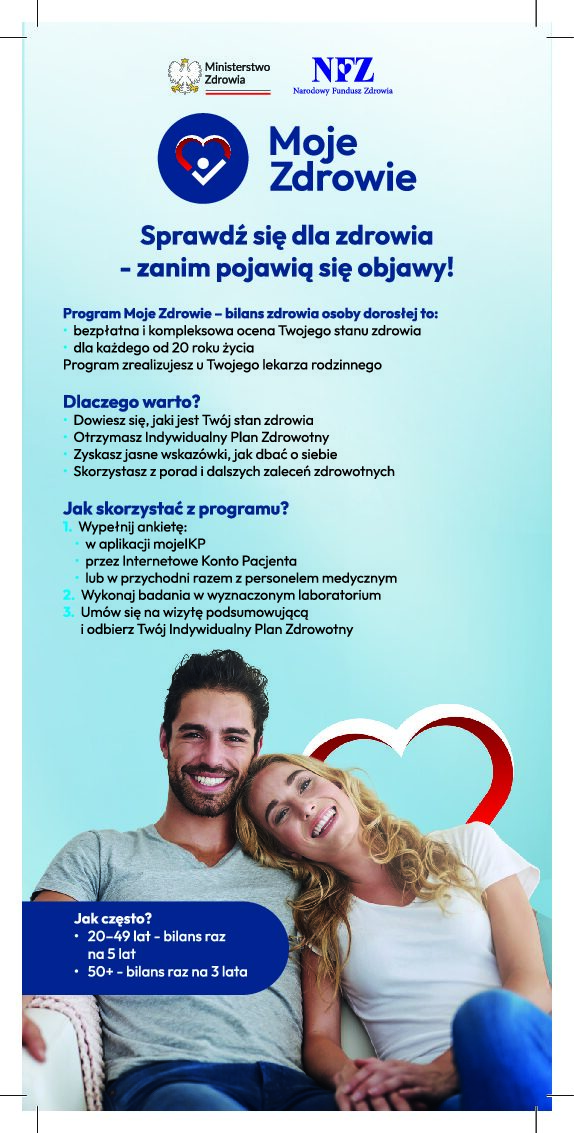 Zachęcamy wszystkich pacjentów do zapoznania się z założeniami programu „Moje Zdrowie”, który jest obecnie realizowany w naszej placówce. Pełny zakres prog